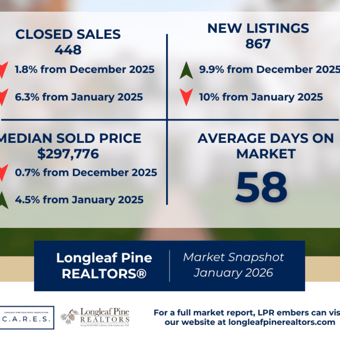 What REALTORS® Are Seeing Across Our Communities Last Month As we begin 2026, the real estate market across the Longleaf Pine REALTORS® region reflects a shift toward more active buyer engagement paired with varied price movement depending on property type and location. January brought increased pending and closed sales activity in several segments, steady new […]