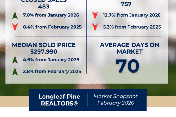 What REALTORS® Are Seeing Across Our Communities Last Month As the spring market begins to take shape, February data across the Longleaf Pine REALTORS® region points to a market with stronger buyer activity, modest inventory growth, and continued price stability. Region-wide, pending sales increased 11.8 percent to 684, while the median sales price rose 2.8 […]